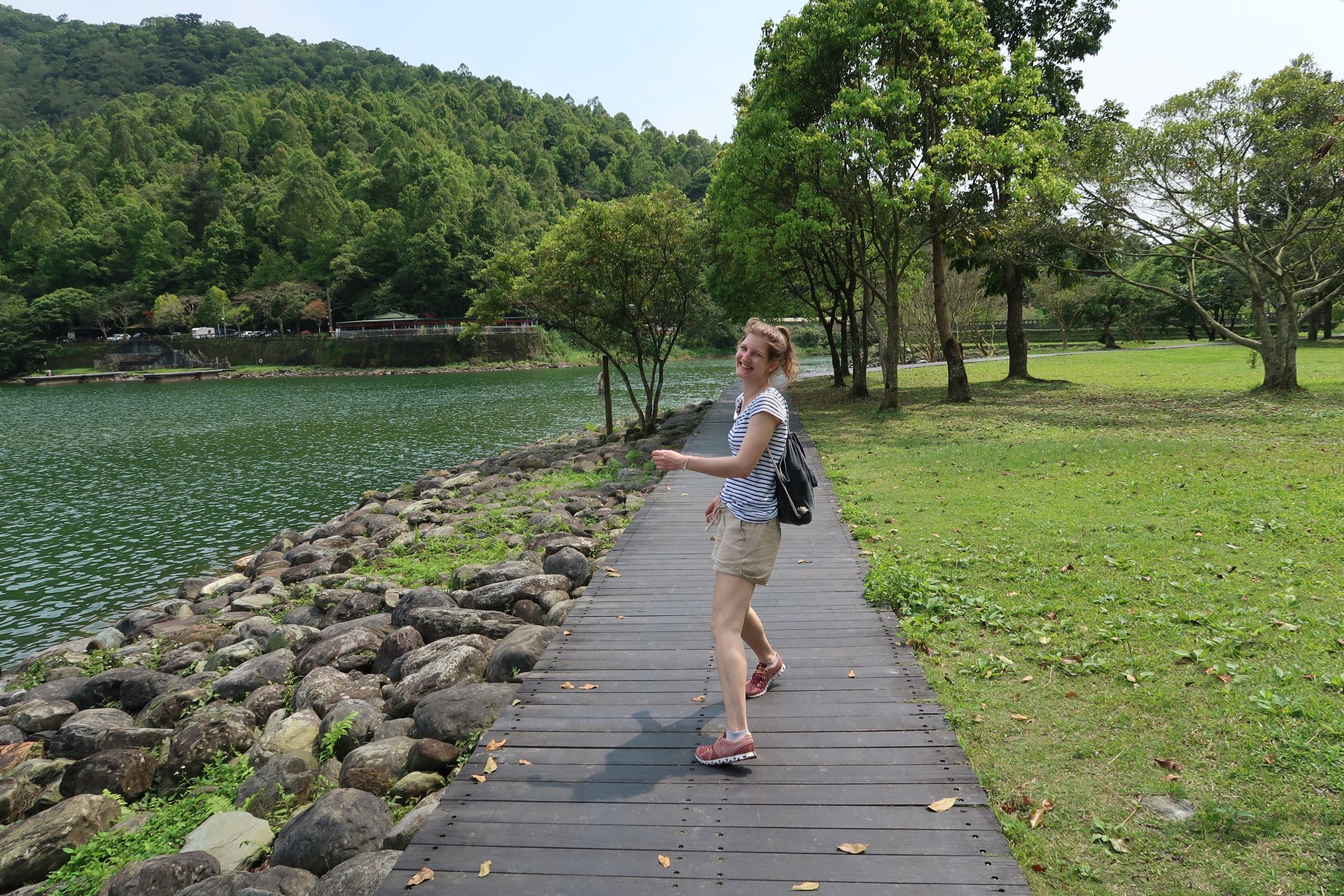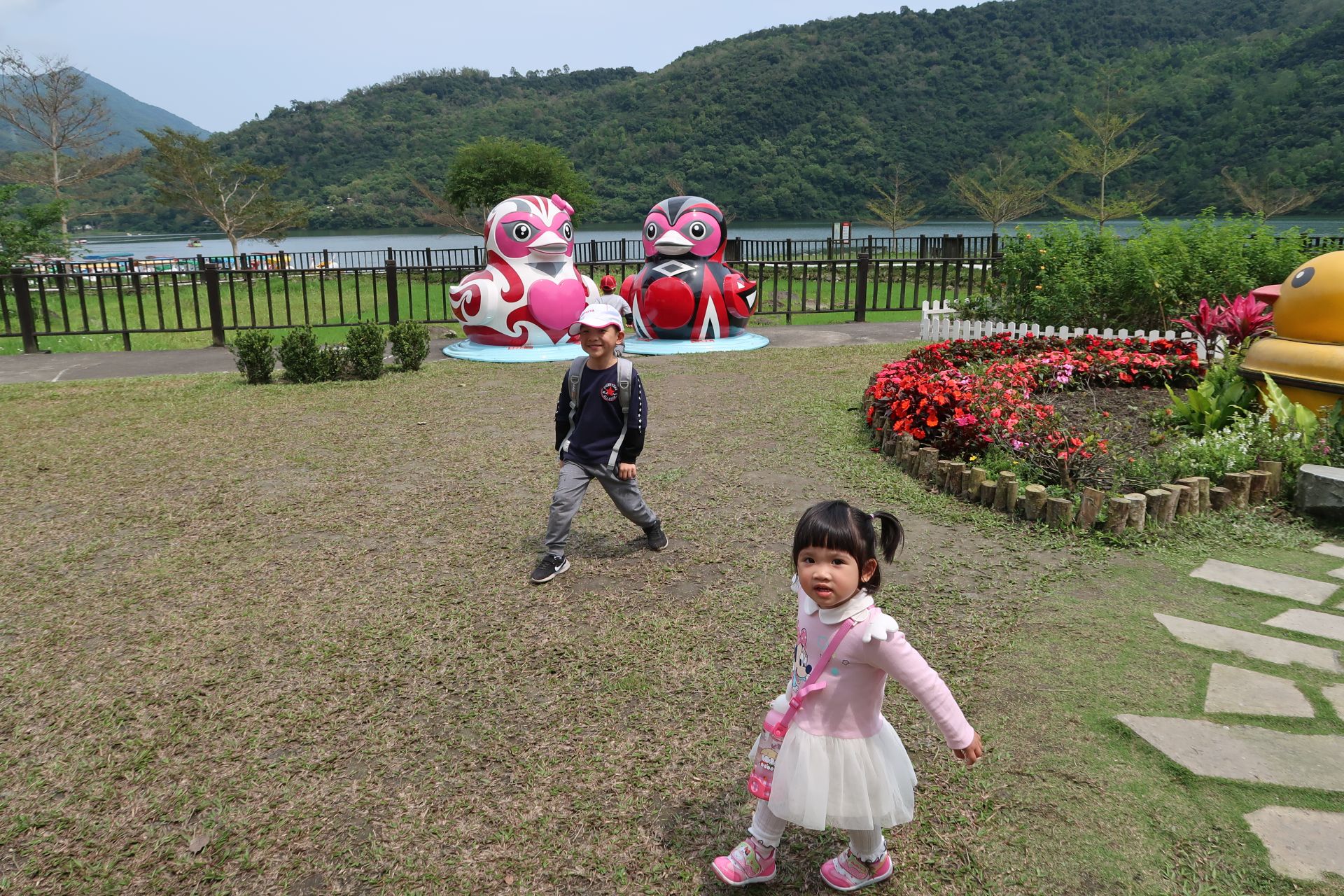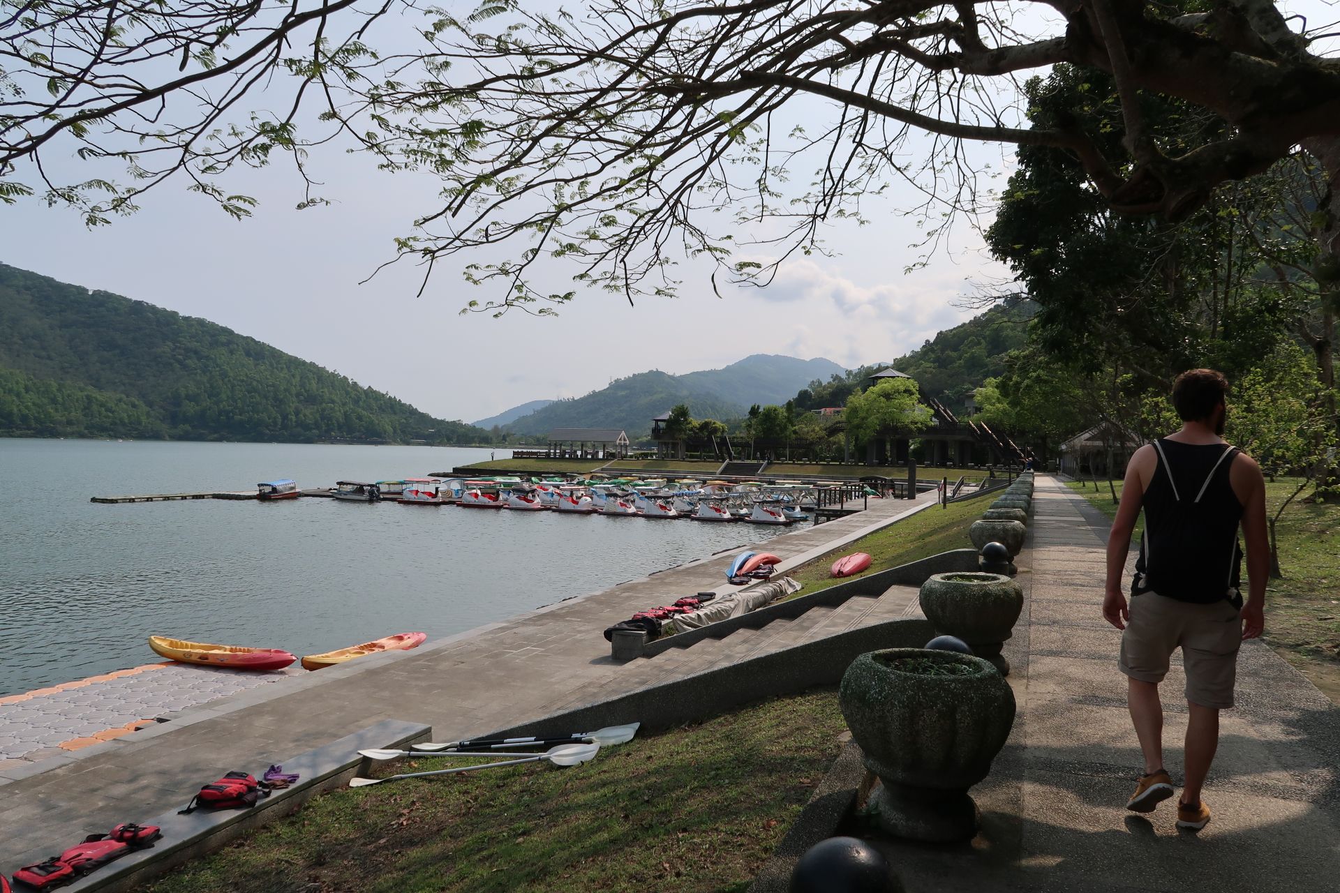 Also konnte es losgehen zum Lake Liyu. Etwa 40 Minuten Fahrt lagen vor uns. Dort angekommen fühlten wir uns gleich ziemlich heimisch. Ein See wie Zuhause in der Schweiz. Mit einem schönen Weg entlang dem Ufer. Und Pedalos. Wir müssen zugeben: Was Pedalos betrifft, sind die Taiwanesen bei der Sujetwahl etwas kreativer als wir Schweizer.