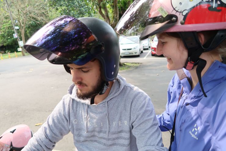 Bei zwei Vermietungen (ja, wirklich Vermietungen) wurden wir direkt wieder weggeschickt. „Only Taiwanese.“ Beim dritten Ort klappte es dann. Wiederum hatten wir innert 5 Minuten unseren Roller. Doch wie es scheint, haben wir zu kleine Köpfe für taiwanesische Verhältnisse. So durfte ich auch Kinderhelme probieren. Die Vermieter lachten sich fast schlapp. Ich fand es weniger lustig, entschied mich dann doch etwas trotzig für den Hello-Kitty-Helm. 😅