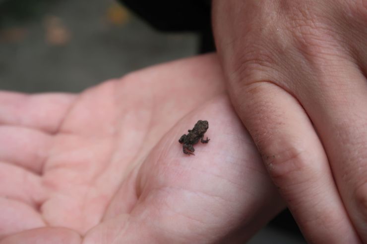 Der Weg führte immer mehr in den Wald. Plötzlich „hüpfte“ es rund um unsere Füsse. Mini-Frösche überquerten hier den Spazierweg. Härzig.