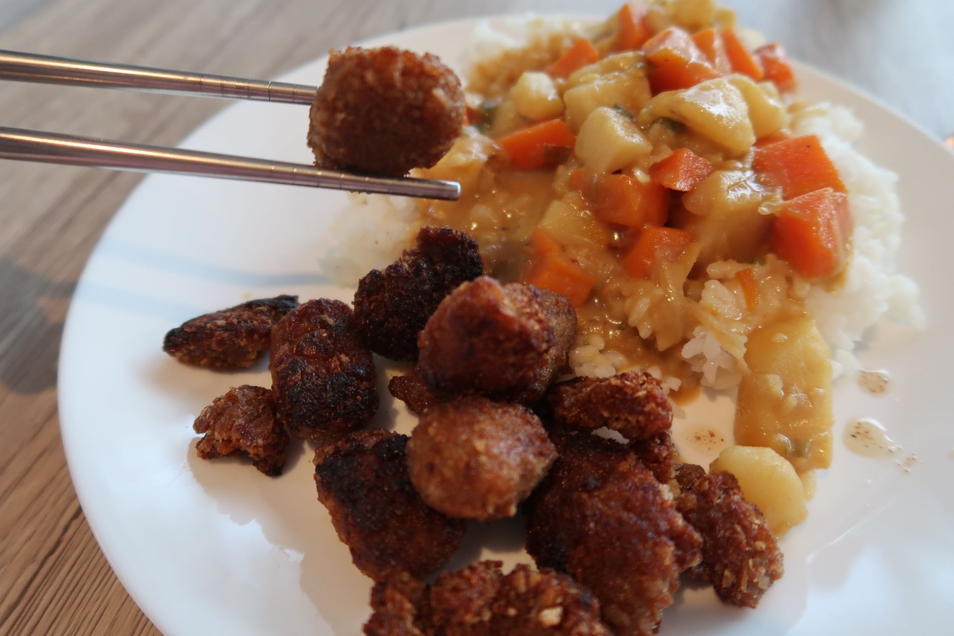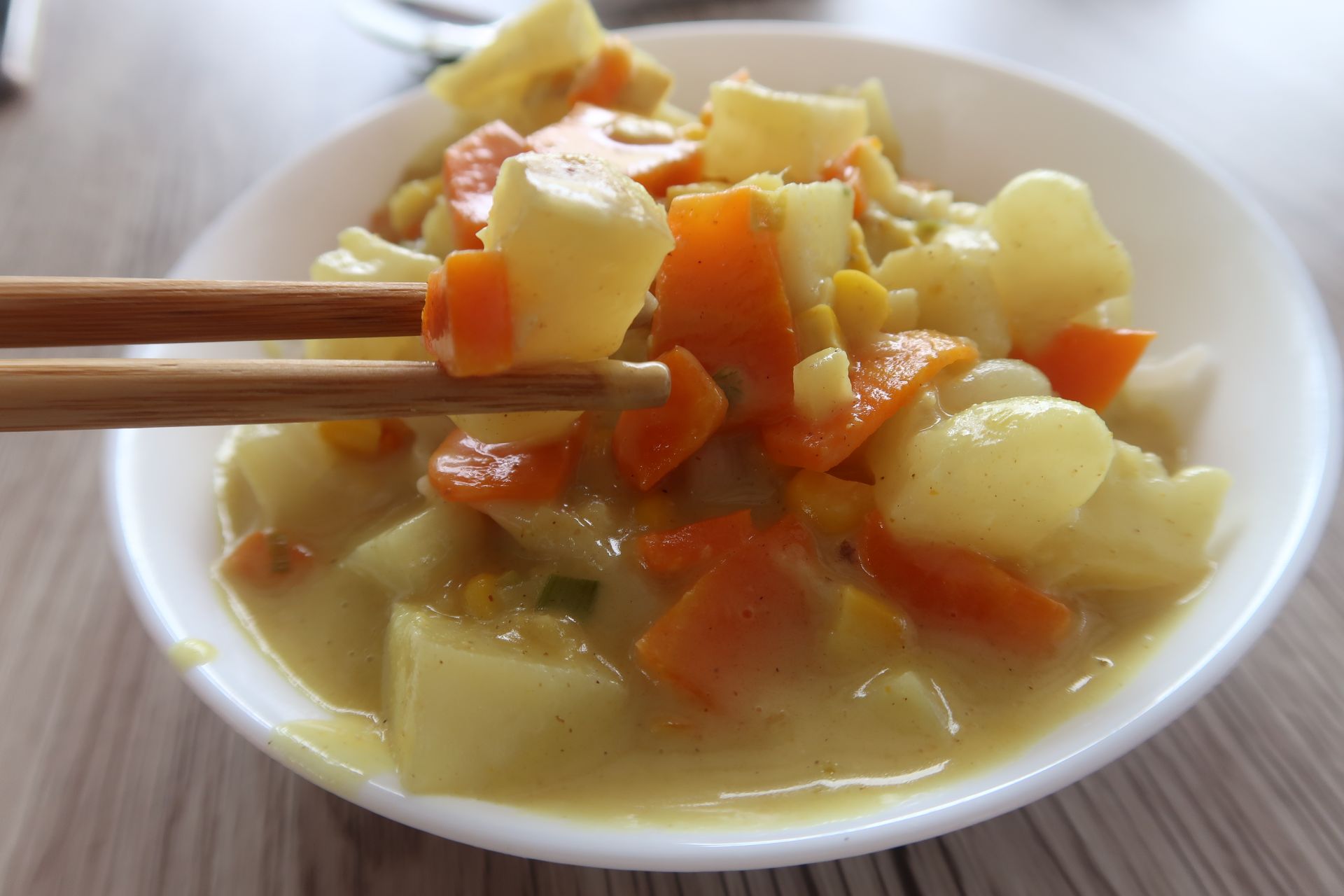 Hier gibt es Gemüse, dass wir in der Schweiz nicht kennen. Das wollten wir testen. Also kauften wir ein weisses, gurkengrosses Gemüse mit einer lustigen, bubble-mässigen Schale. Keine Ahnung, was das war. Wir schätzten etwas zwischen einem Kürbis und einem Kohlrabi. Zuversichtlich schnitten wir das Gemüse und kochten es zusammen mit Karotten und Kartoffeln. In einer Curry-Sauce. 😜