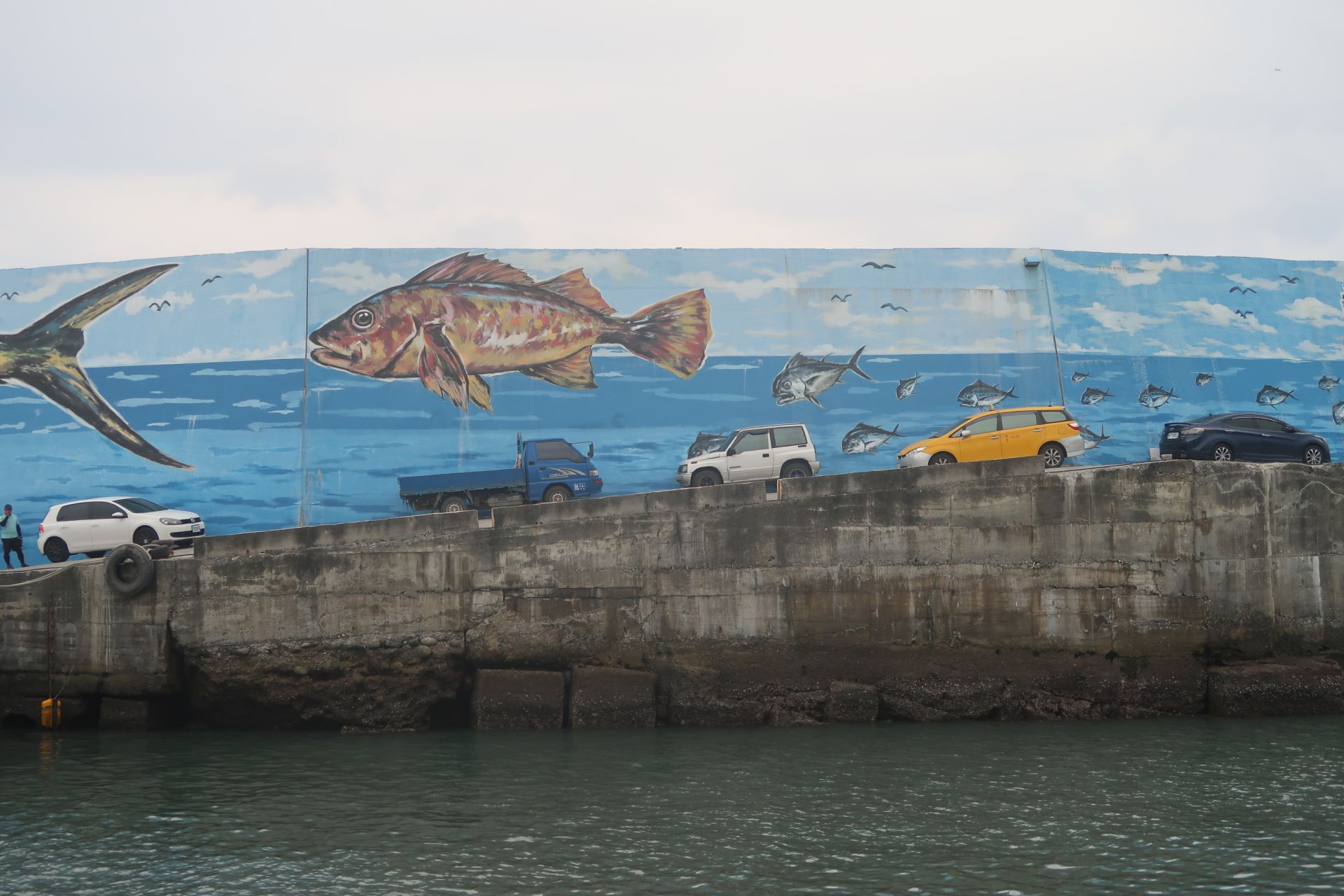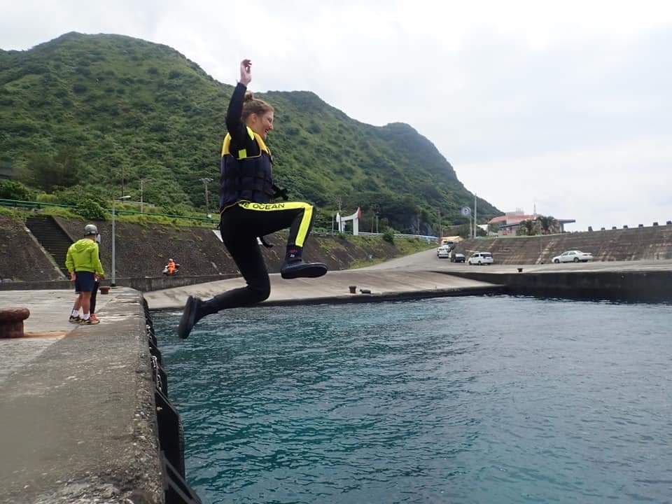 Als wir bei der Rückfahrt am Schnorchel-Treffpunkt vorbeifuhren, waren wir etwas irritiert. Werden wir uns noch einen zweiten Schnorchelspot ansehen? Doch die Fahrt endete bereits beim Hafen. „You jump, I take picture.“ So konnte einer nach dem anderen von der Strasse aus ins Hafenbecken springen. Höhe: 1.5 m, maximal. Doch für die „wasserscheuen“ Taiwanesen war dies wohl eine riesen Sache. Sie zögerten, nahmen Anlauf, stoppen, zögerten, kicherten, schauten sich um und sprangen dann endlich ins Wasser. Eigentlich hätten wir diese Zeit lieber noch bei den Korallen verbracht. Aber egal. Es war lustig den anderen zuzuschauen, während wir uns nach dem Sprung von der Schwimmweste durchs Hafenbecken treiben liessen.