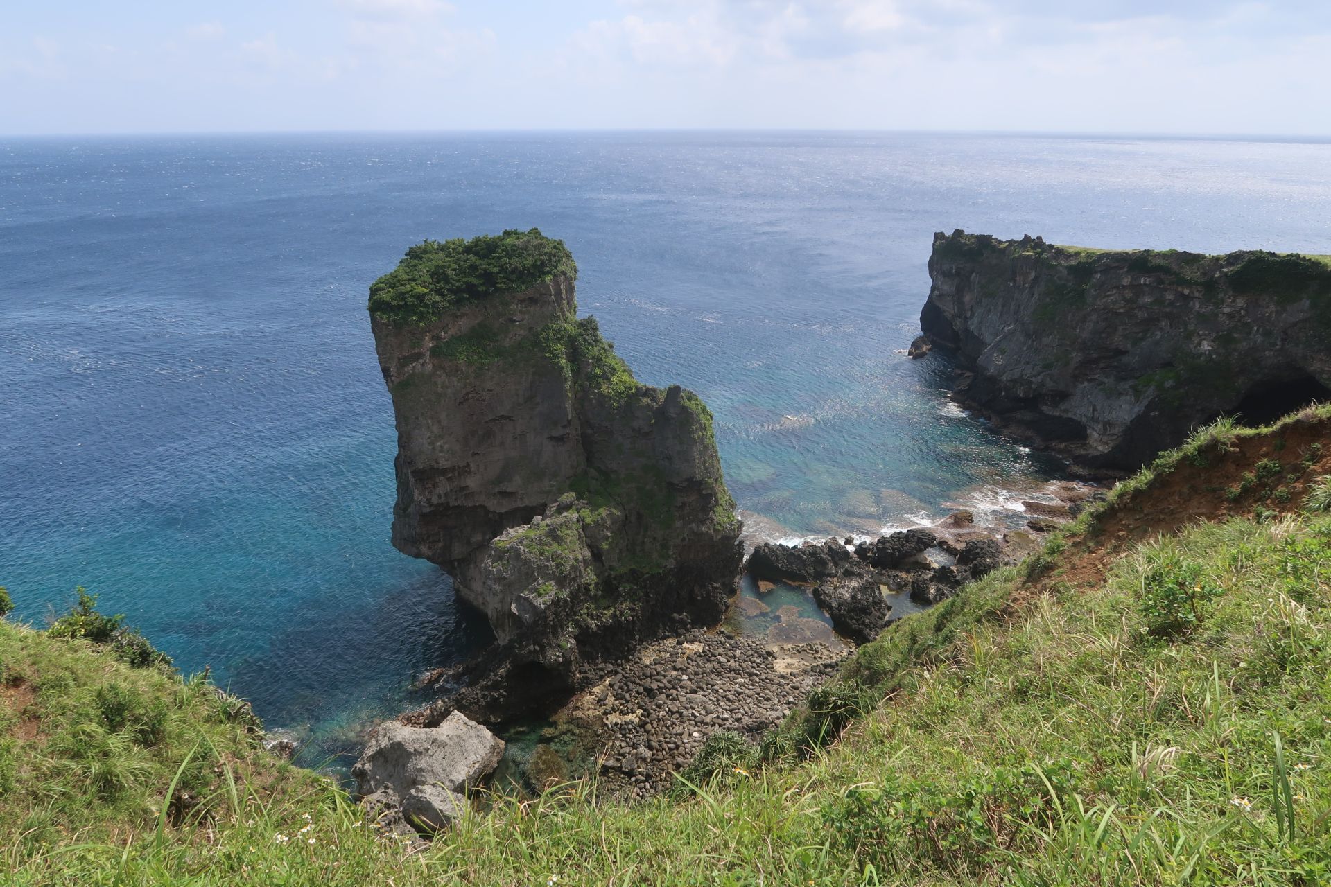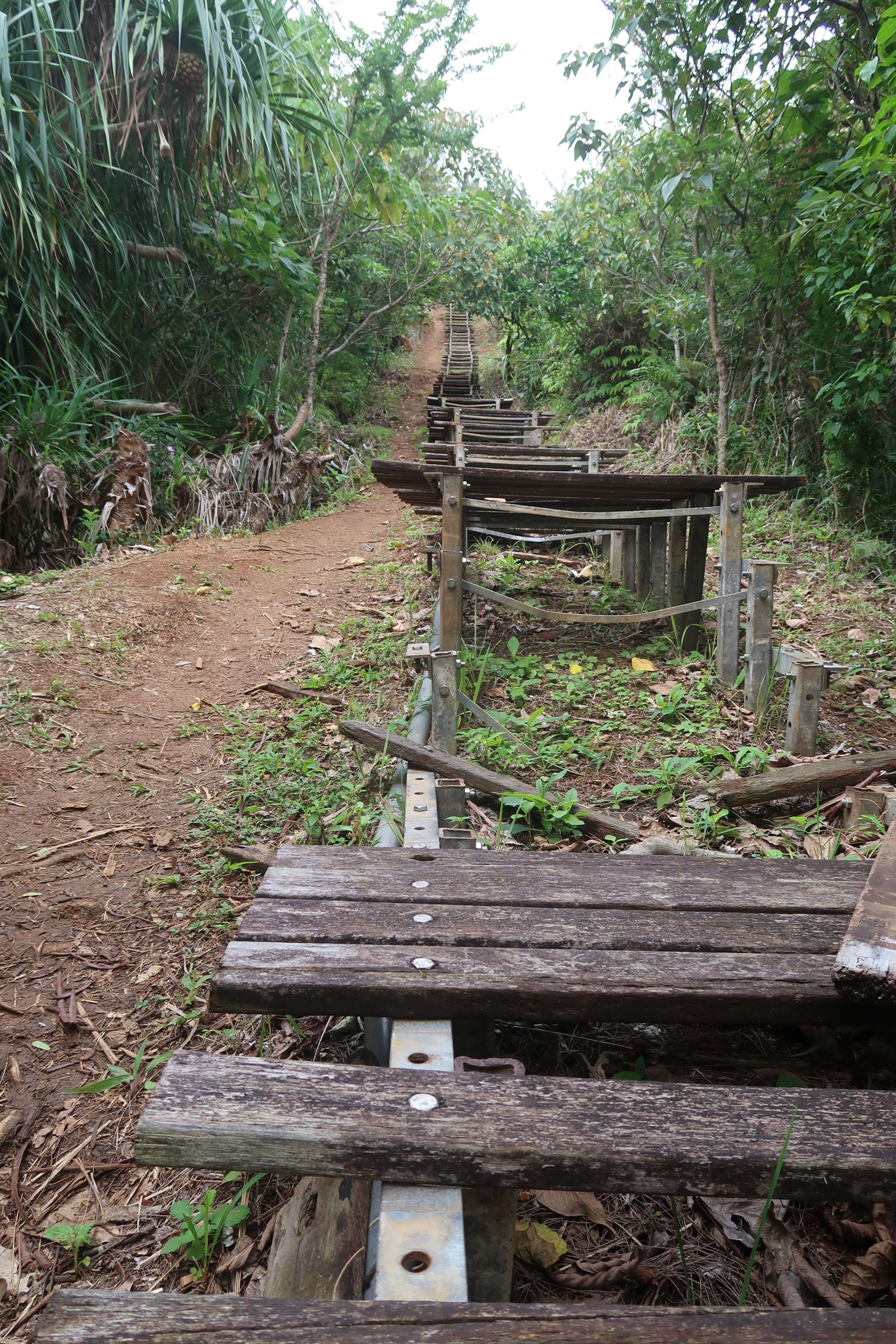 Auf dem Weg rund um die Insel hat eine Holztreppe am Strassenrand unsere Aufmerksamkeit auf sich gezogen. Wir schlenderten die erhöhte Holztreppe hinauf. Deren Zustand verschlechterte sich zunehmend, da das Holz morsch war und die Stufen in sich zusammenbrachen. Also ging es neben der Treppe, gleich beim Gebüsch, weiter den Hügel hinauf. Gräser, Wurzeln, Büsche. Wohin dieser Weg wohl führte? Nach etwa 20 Minuten Marsch stoppte Remo abrupt.