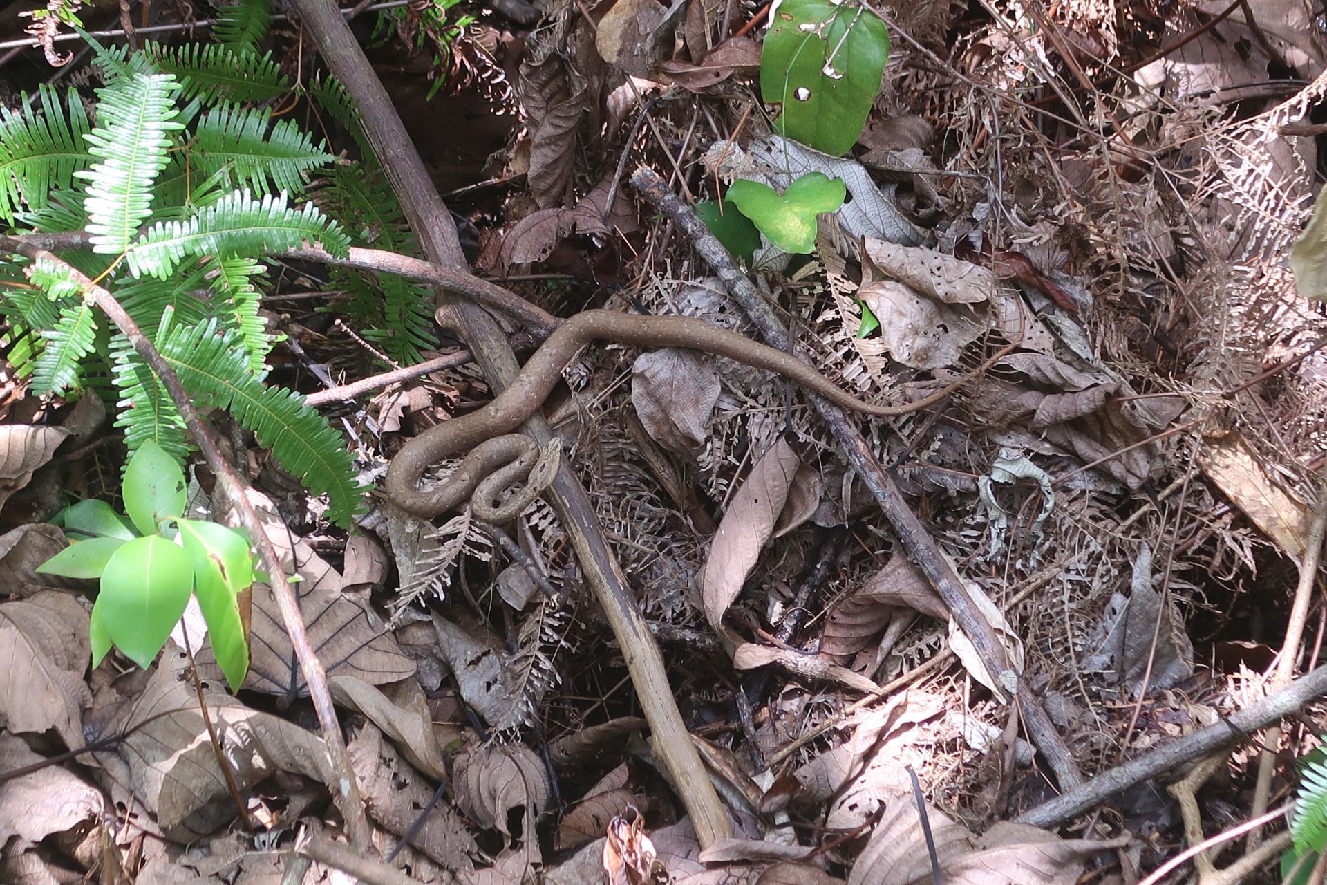 „Ich glaube, da ist eine Schlange. Aber ich bin mir nicht sicher.“ Er zeigt mir die Richtung und auch ich sah etwas, dass wie eine Schlange aussah. Dieses etwas bewegte sich aber nicht und hatte eine hellbraune Farbe wie die Wurzeln rundherum. Wir warfen einen Stein in ihre Richtung, um auf Nummer sicher zu gehen und schwup wechselte sie ihre Position. Tatsächlich eine Schlage. O-ooh. Hat es noch mehr davon hier? Wir machten sofort kehrt und gingen eilig zurück zum Roller. Wir sind beide nicht sonderlich Fan von diesen Tieren. Vor allem nicht, wenn wir in Flipflops und Shorts unterwegs sind.