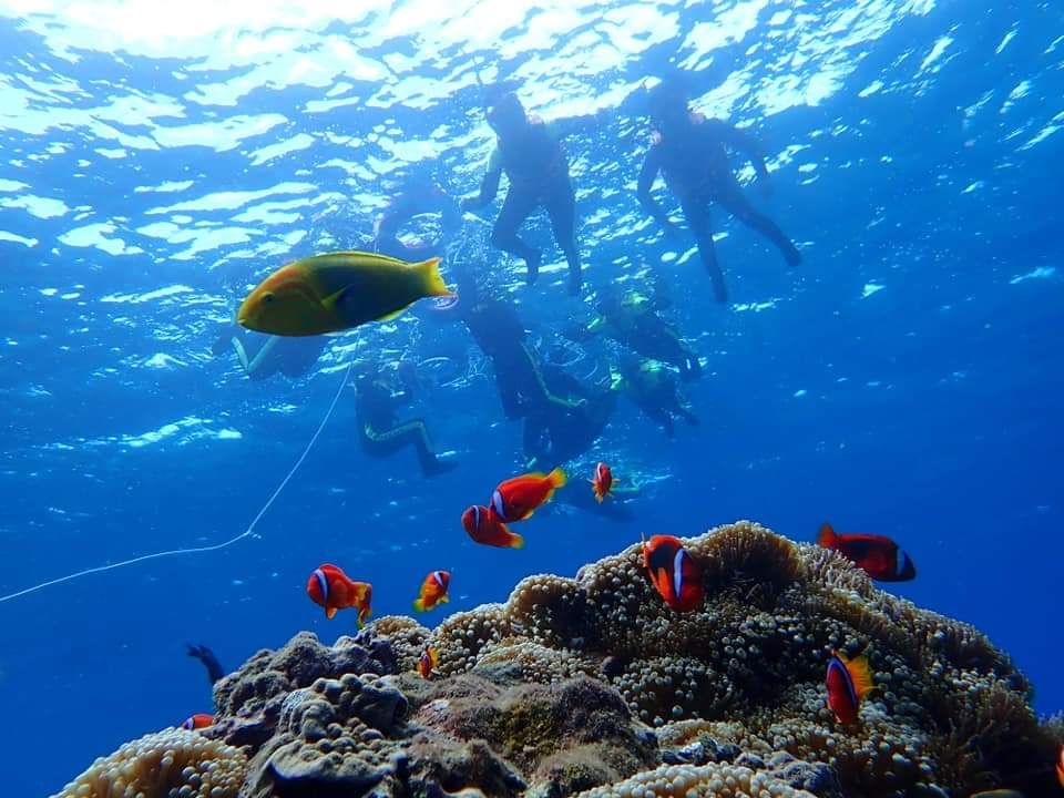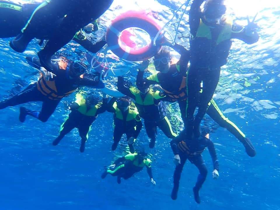 Wir erhielten dann eine komplette Schnorchel-Ausrüstung: Neoprenanzug, Neoprenschuhe, Schwimmweste, Schnorchel und Taucherbrille. Zuerst belächelten wir die Ausrüstung, denn wir wussten ja, wie warm das Meer war. Doch später waren wir froh darum. In unserer Ausrüstung setzten wir uns dann auf den Roller und fuhren wie eine kleine „Roller-Gang“ alle nacheinander zum Schnorchelspot.