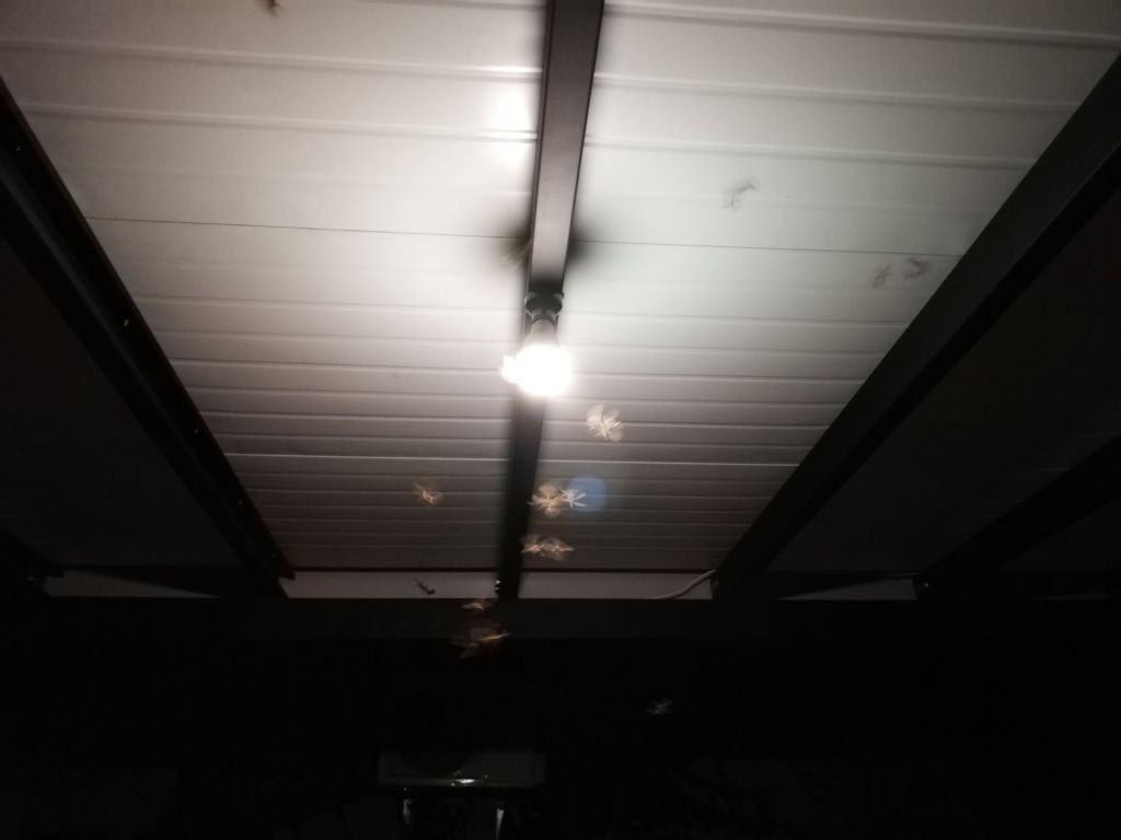 Im Outdoor-Wohnzimmer gibt es zwei Lampen bzw. Glühbirnen. In den Tagen rund um den Vollmond gab es ein Zeitfenster von vielleicht 45 Minuten (kurz nach 18.00 Uhr), wo sich Hunderte von mittelgrossen Fliegen um diese zwei Lichtquellen versammelten.