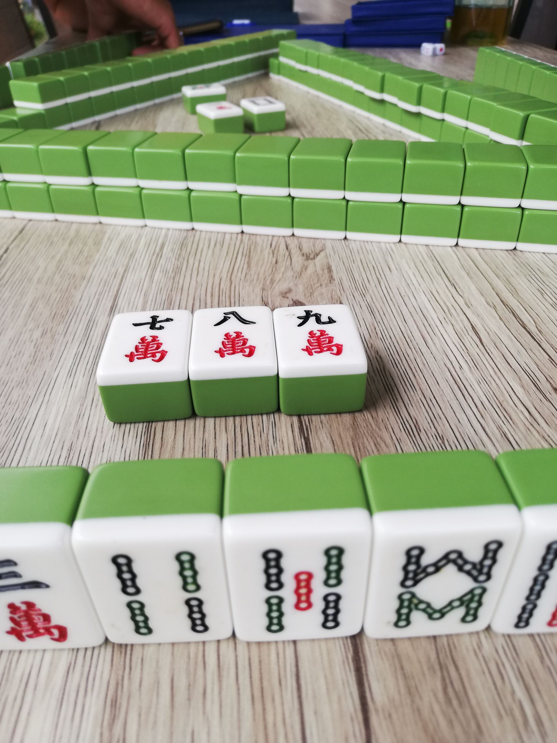 Es ist vergleichbar mit Rummikub, ist aber viel komplexer. Gespielt wird immer zu viert. Dabei versucht man mit 16 Steinen möglichst schnell „Drillinge“ zusammenzustellen, also drei gleiche Steine oder eine Reihe von drei Steinen. Dabei wird immer der Reihe nach ein Stein aufgenommen und dann einen „unbrauchbaren“ aus der eigenen „Sammlung“ in die Mitte gelegt. Diesen „verworfenen“ Stein können dann die anderen Mitspieler für sich beanspruchen. Gewonnen hat, wer zuerst alle Steine in einer „3er-Gruppe“ untergebracht hat. Der Gewinner einer Runde erhält je nach Konstellation der „Drillinge“ gewisse Punkte. Oft wird bei diesem Spiel um Geld gespielt. Um so mehr Punkte, um so mehr Geld gewinnt man.