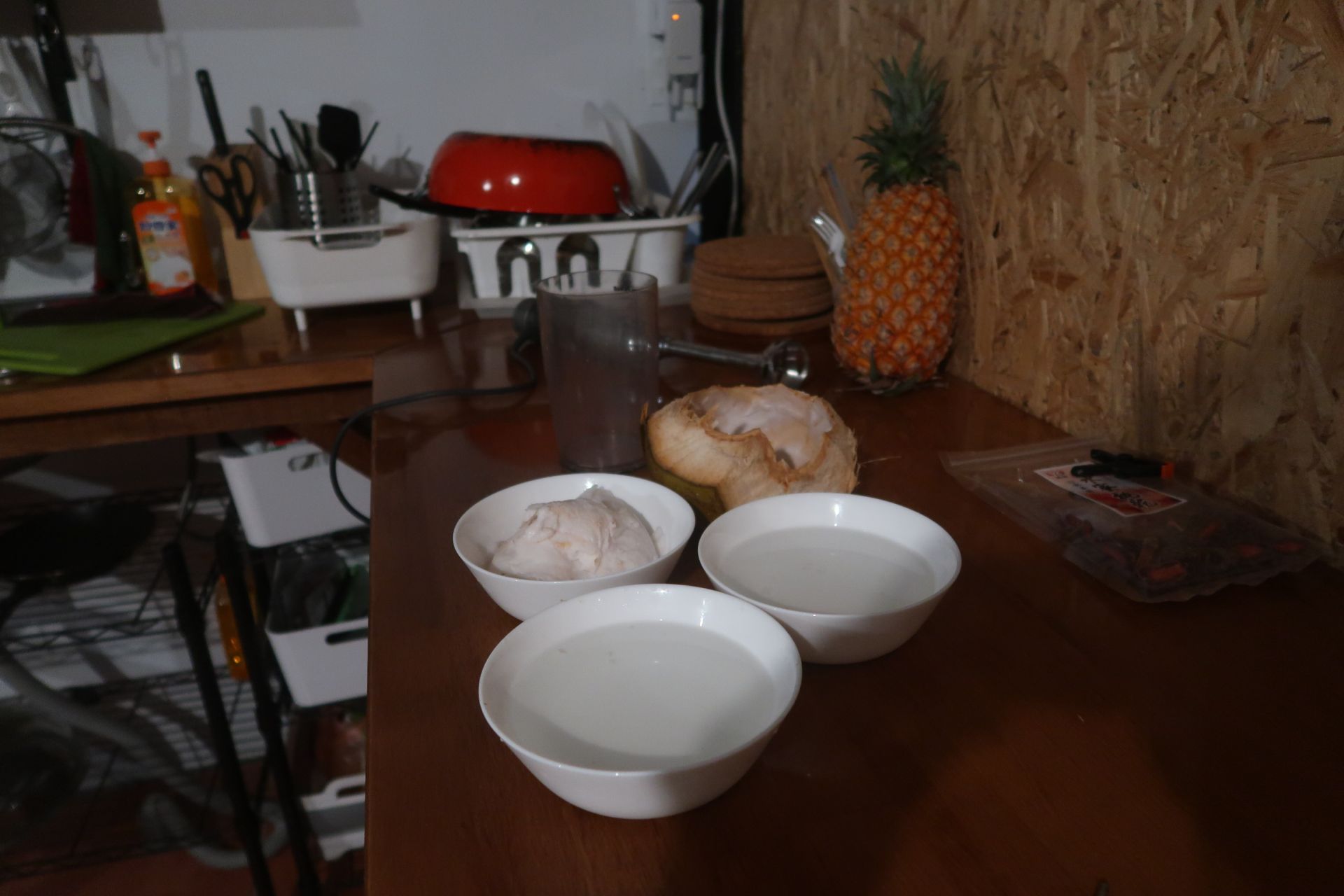 Mit dem Stabmixer zerkleinerten wir die Ananasstücke zu Ananassaft und das Kokoswasser zusammen mit dem Kokosfleisch zu einer Art Kokosmilch. Frischer zubereitet erhält man einen Piña Colada nirgends.