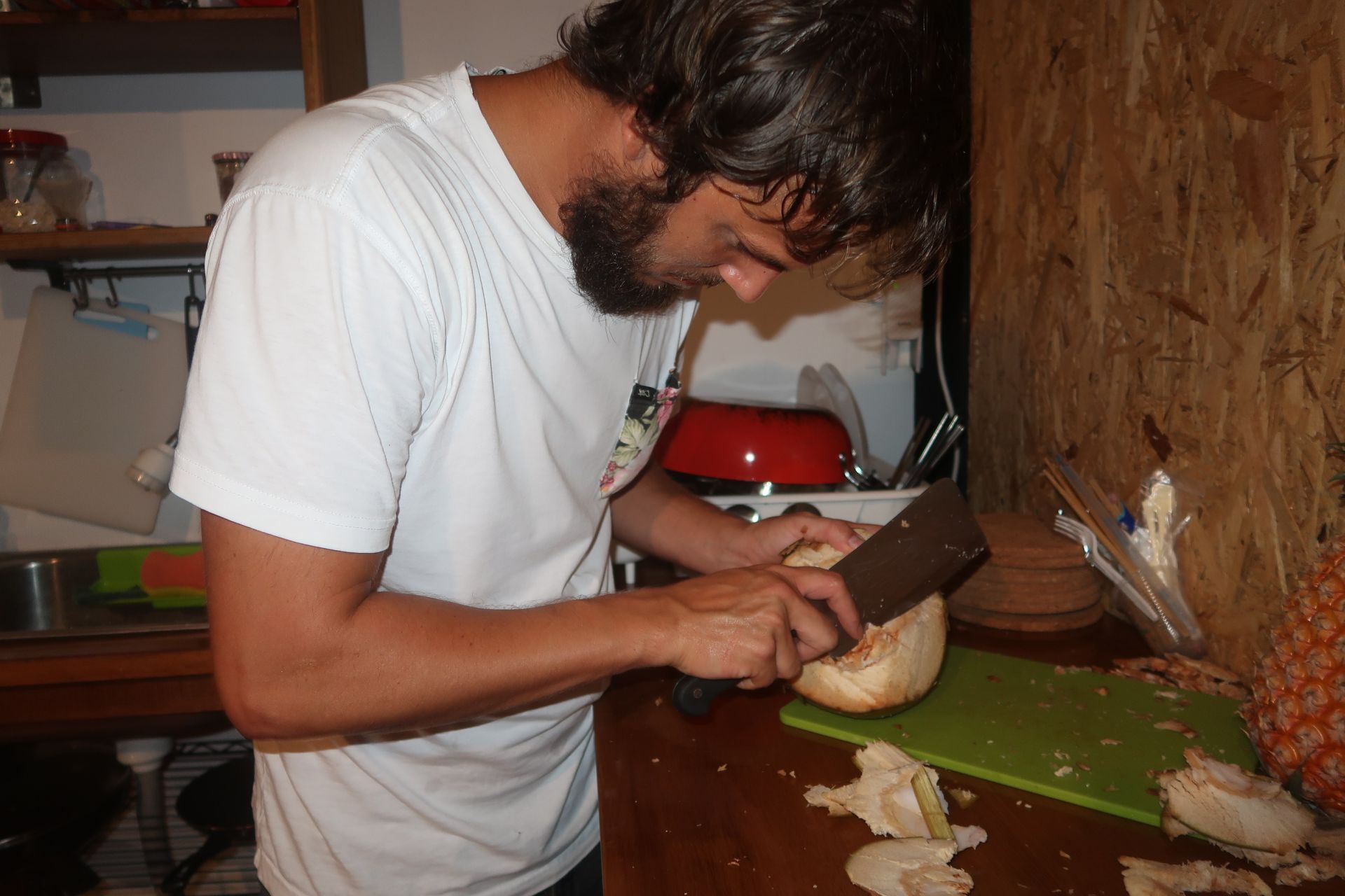 Wie man Ananas schneidet, wissen wir mittlerweile. Das ist oft unser Nachmittags-Snack. Doch mit der Kokosnuss taten wir uns doch etwas schwer. Vielleicht lag es auch daran, dass wir in der Küche kein wirklich geeignetes Messer fanden. So kämpfte Remo ca. 15 Minuten lang mit der Kokosnuss, bis wir endlich zum Kokoswasser und -fleisch vordrangen.