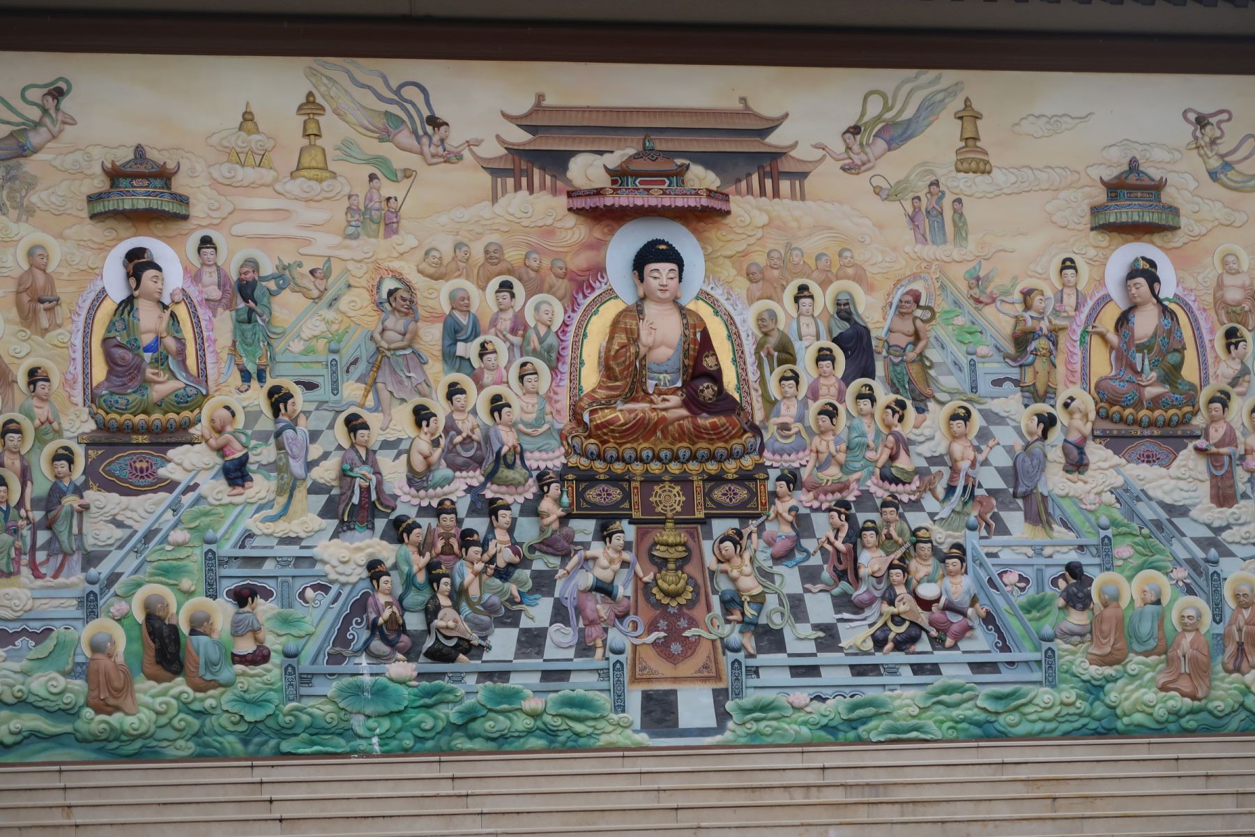 Also hörten wir gespannt zu, was uns die Mönchin über diesen Ort erzählte. Hier werden literarischen Werke von Venerable Master Hsing Yun gesammelt. Spannend, was dieser Herr weltweit bereits auf die Beine gestellt hat. Er hat den Fo Guang Shan Orden gegründet, mehrere Universitäten, Schulen und Tempel eröffnet sowie zahlreiche Hilfsprojekte ins Leben gerufen. Im Zentrum steht der humanistische Buddhismus, eine moderne Philosophie, die vom chinesischen Buddhismus abgeleitet ist und vor allem auf die Integration von buddhistischen Praktiken im Lebensalltag fokussiert. Viele Lebensweisheiten hingen auch in dieser grossen Halle als Schriftzeichen an den Wänden. Handgefertigt von Hsing Yun persönlich, der diese als alter, blinder Herr gezeichnet hat. Darauf war die Mönchin besonders stolz. Das merkte man ihr an.