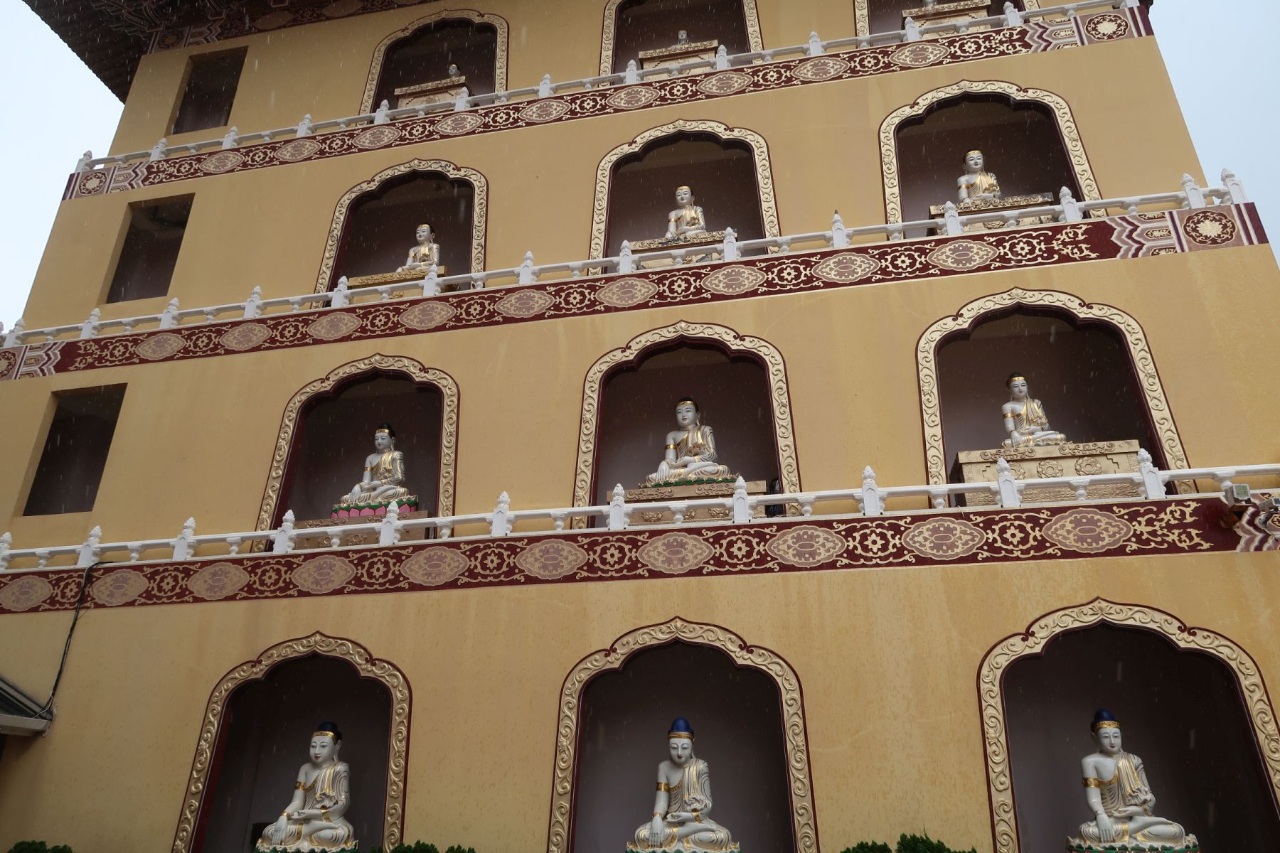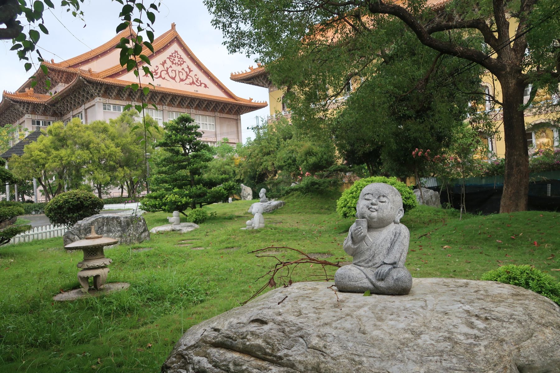 Wir nahmen auch noch den letzten Bitzen auf uns und ging noch etwas weiter zum Fo Guang Shan Kloster. Dort angekommen, waren wir trotz Regenschirm plitschnass. Die Haupthalle war gesperrt. Es schien eine Zeremonie im Gange zu sein. Draussen war sogar ein Kamerateam stationiert. Was da wohl los war? Wir wissen es bis heute nicht.